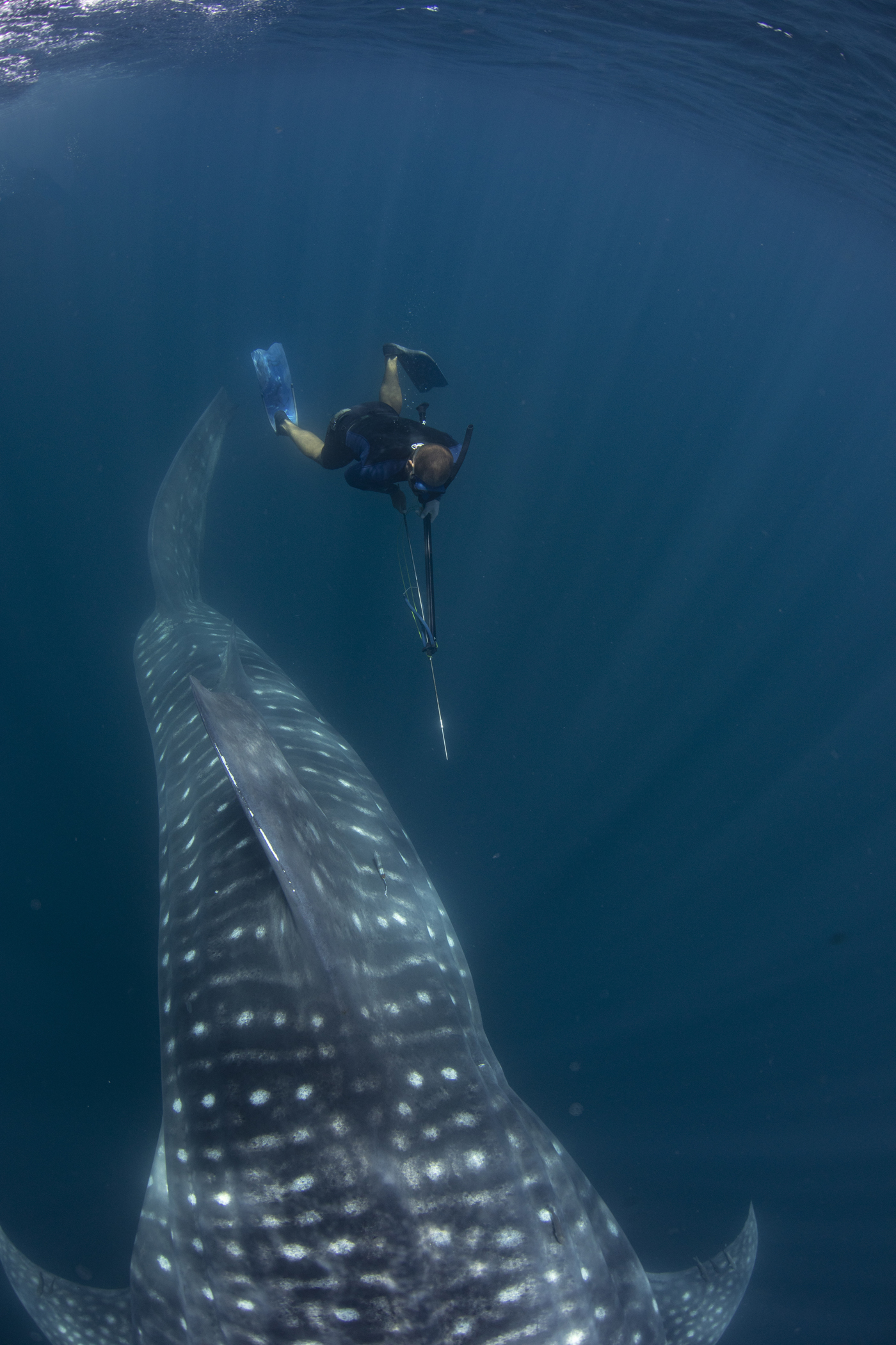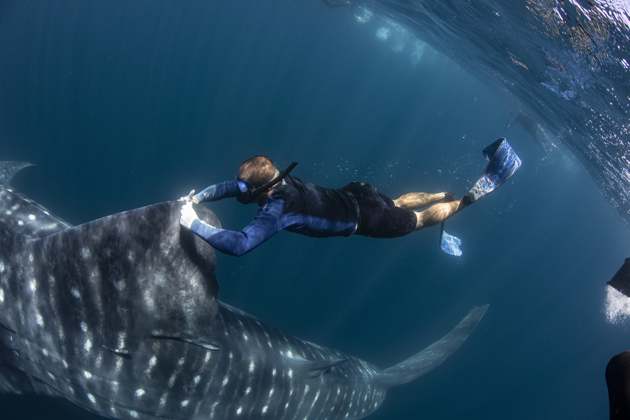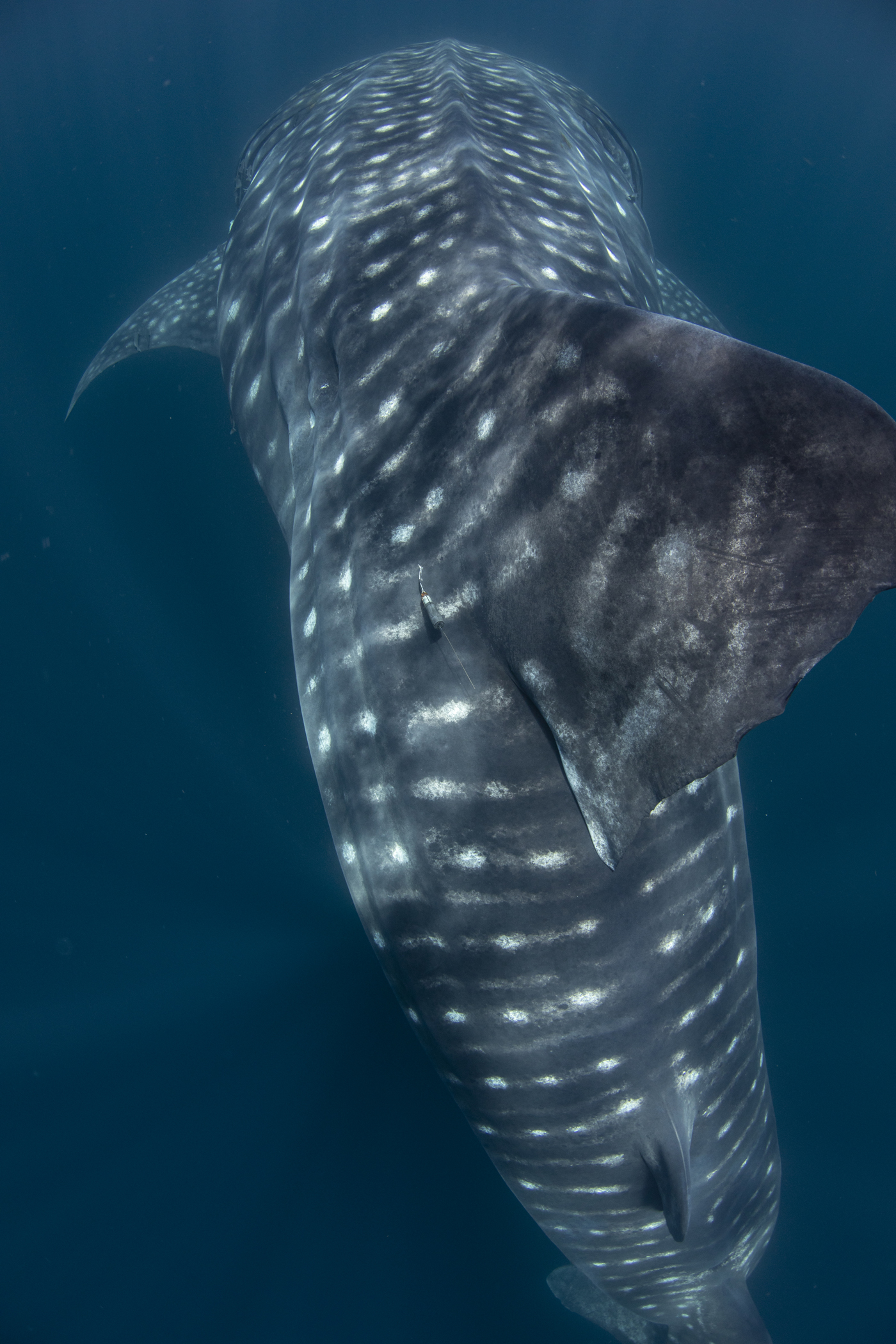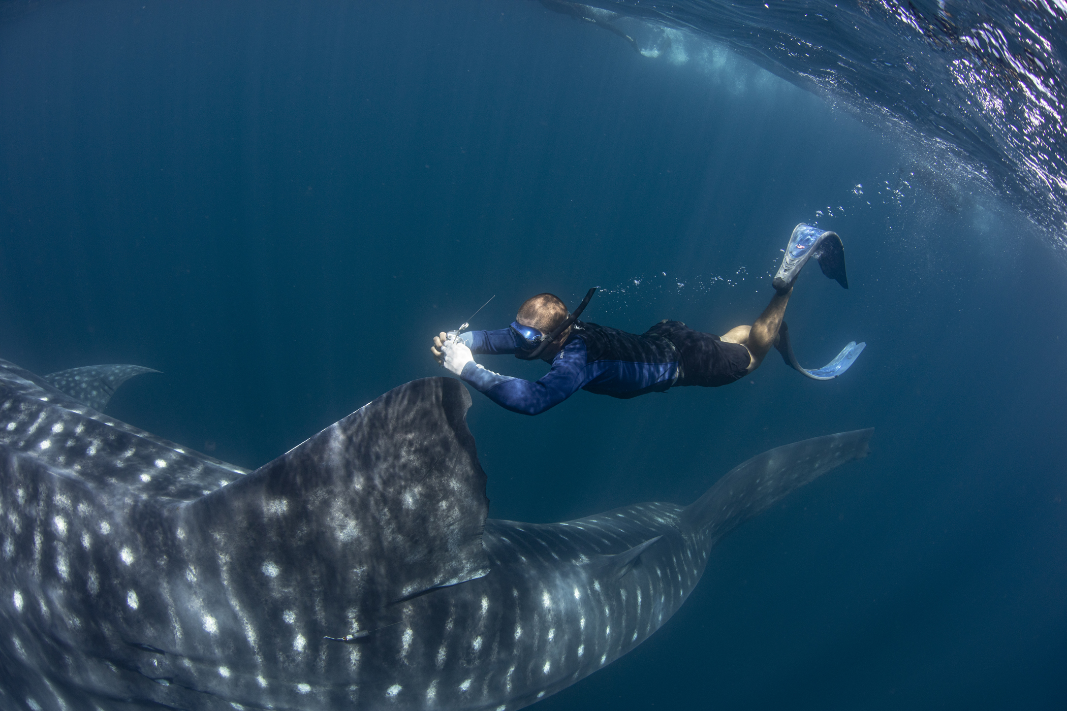 our team was dwarfed by the size of these huge fish… the smallest we encountered was 11m, cruising along the surface and patiently allowing us to jump in the water, swimming as fast as we could vs the whale sharks cruising speed, while we placed the tags, hung on and tried to get some blood samples and then swim up for a quick breath of air before heading back down to try again. Exhausting but rewarding work and hopefully the satellite tags are going to give researchers a lot more information about where these animals head off to once they leave the bay and thus, help to improve and enforce their protections.