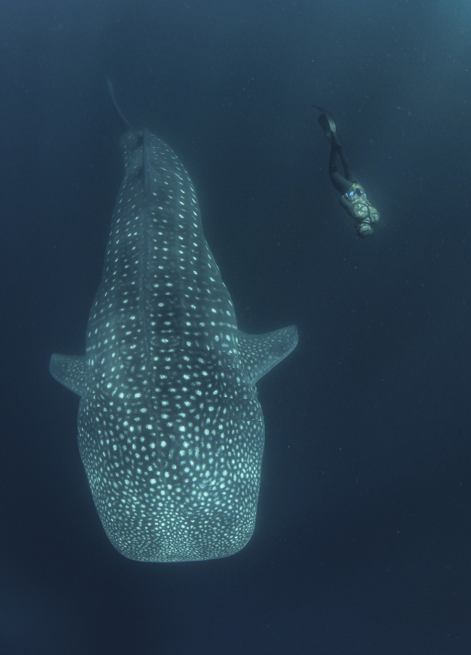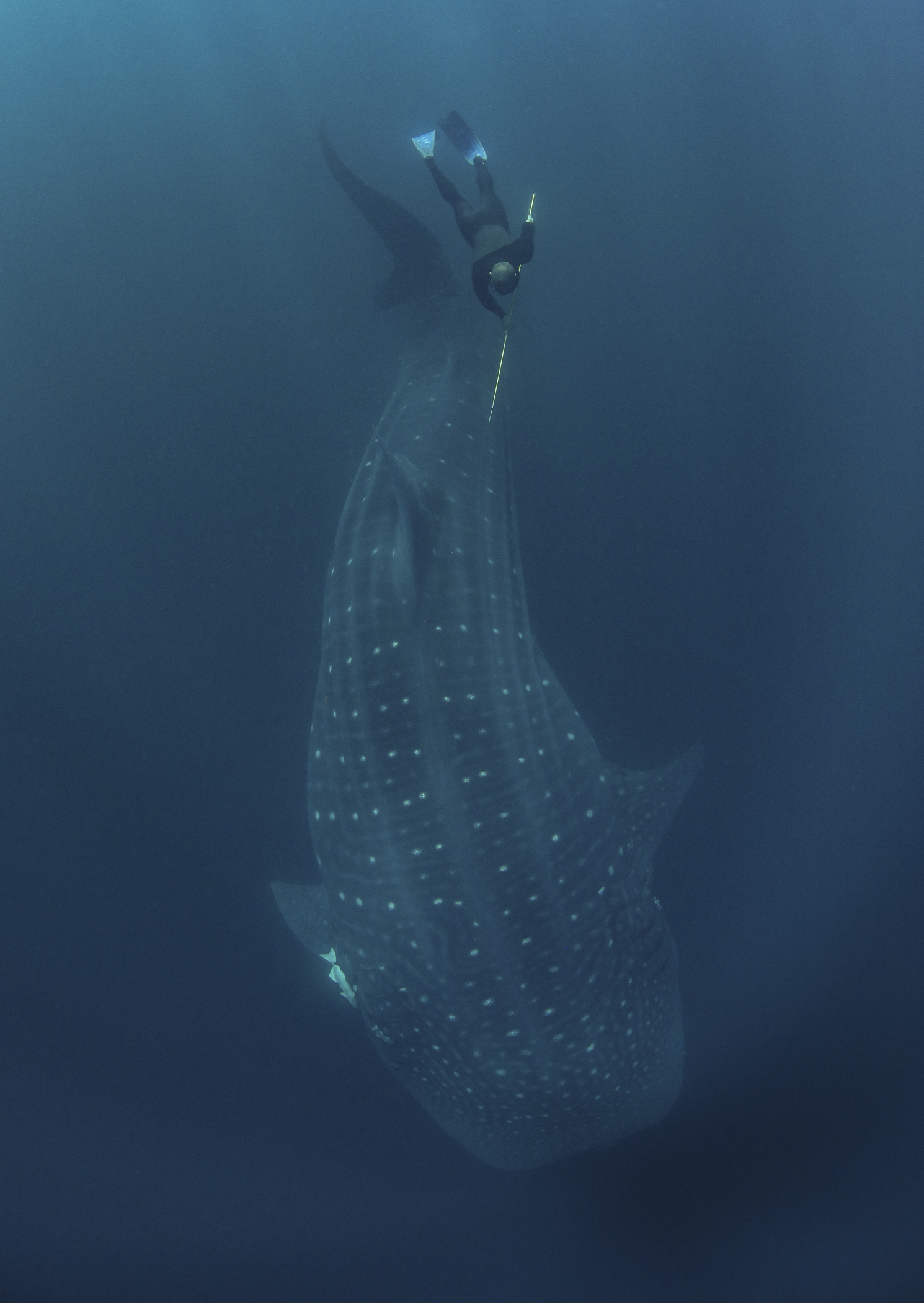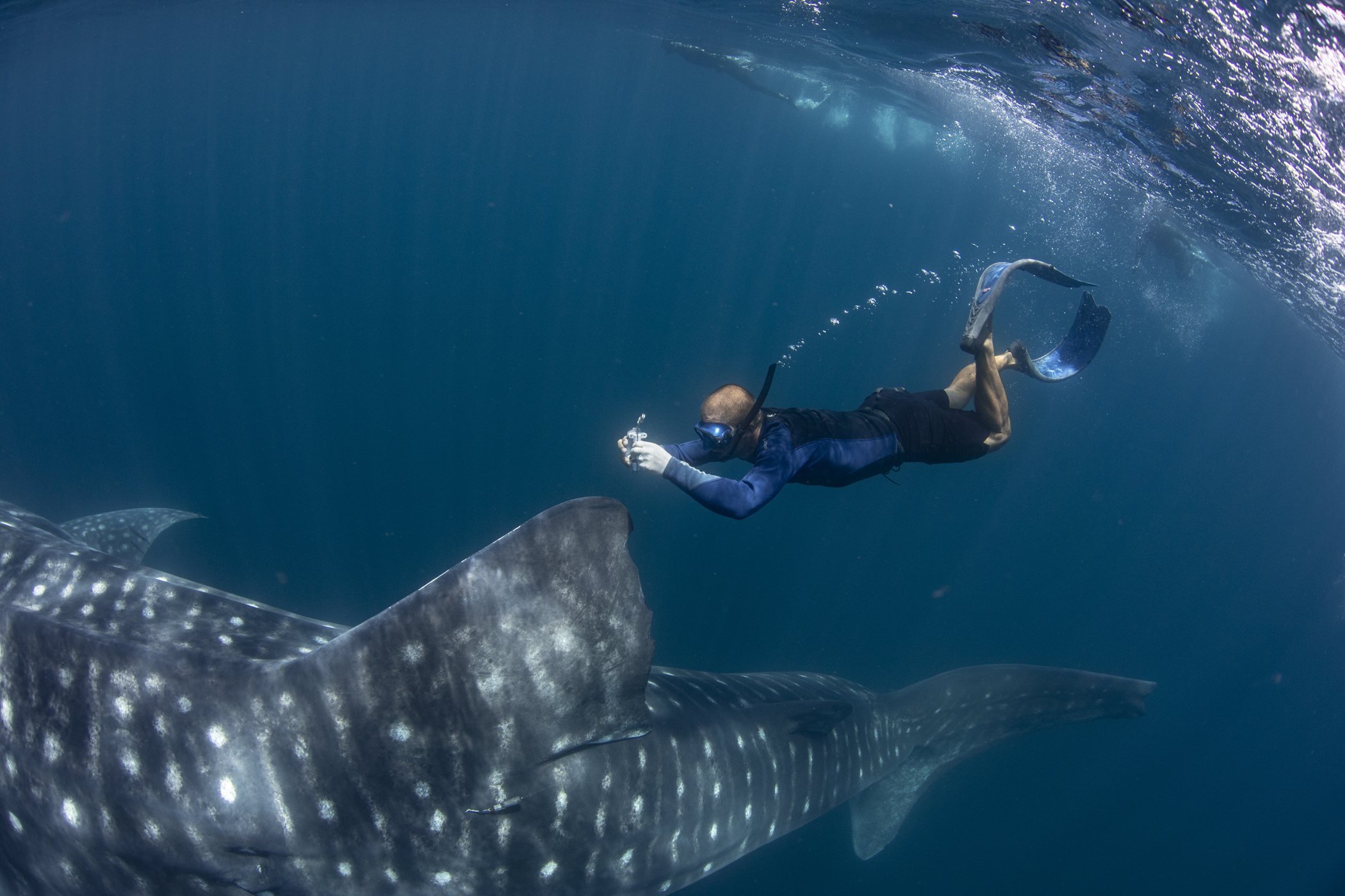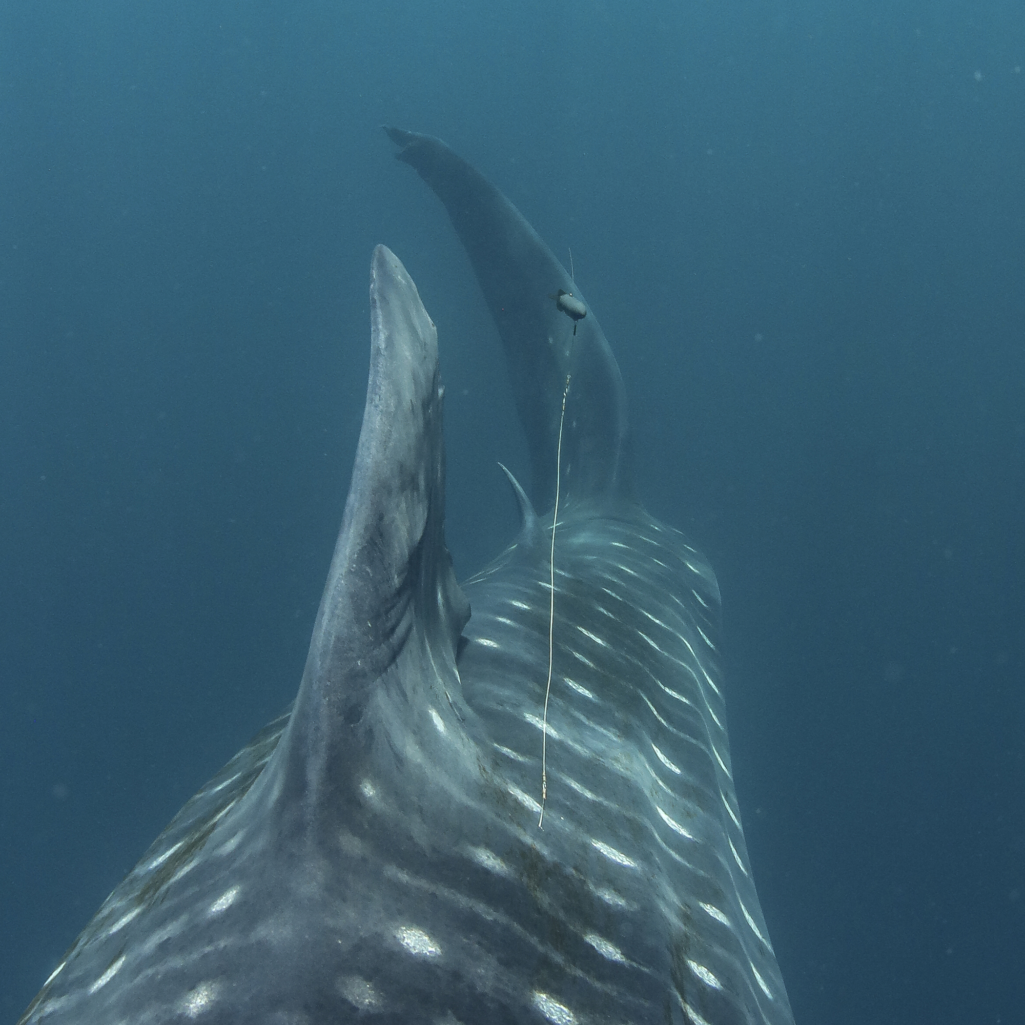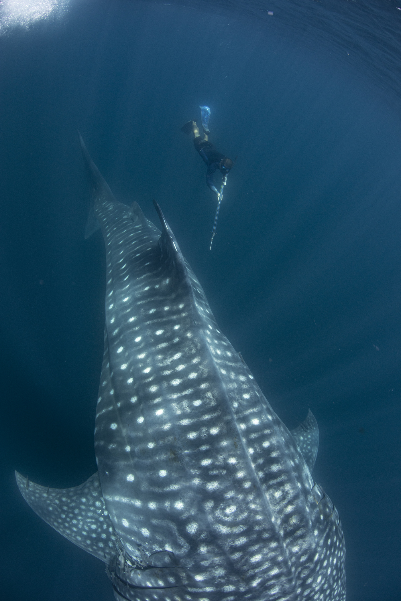 our team was dwarfed by the size of these huge fish… the smallest we encountered was 11m, cruising along the surface and patiently allowing us to jump in the water, swimming as fast as we could vs the whale sharks cruising speed, while we placed the tags, hung on and tried to get some blood samples and then swim up for a quick breath of air before heading back down to try again. Exhausting but rewarding work and hopefully the satellite tags are going to give researchers a lot more information about where these animals head off to once they leave the bay and thus, help to improve and enforce their protections.