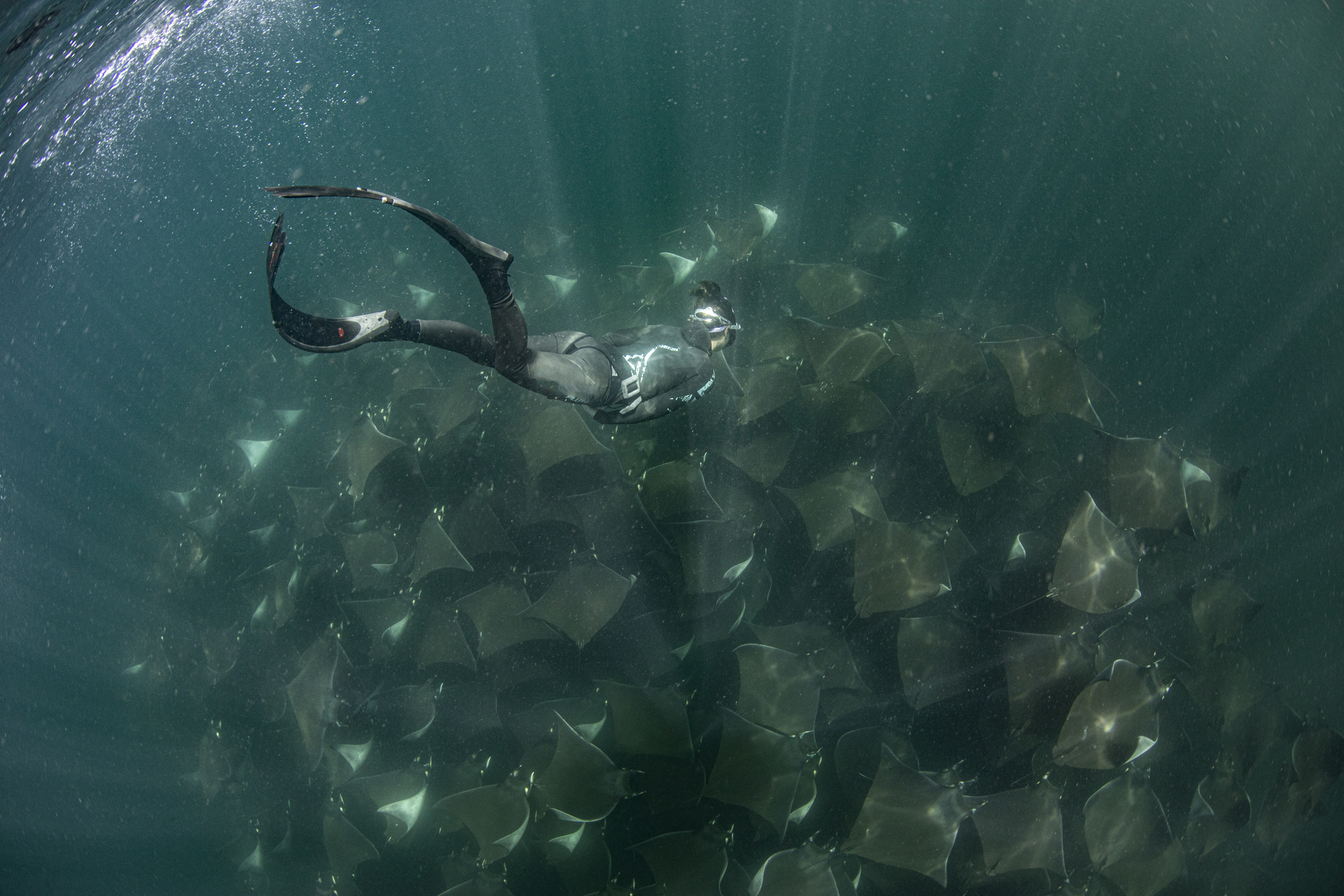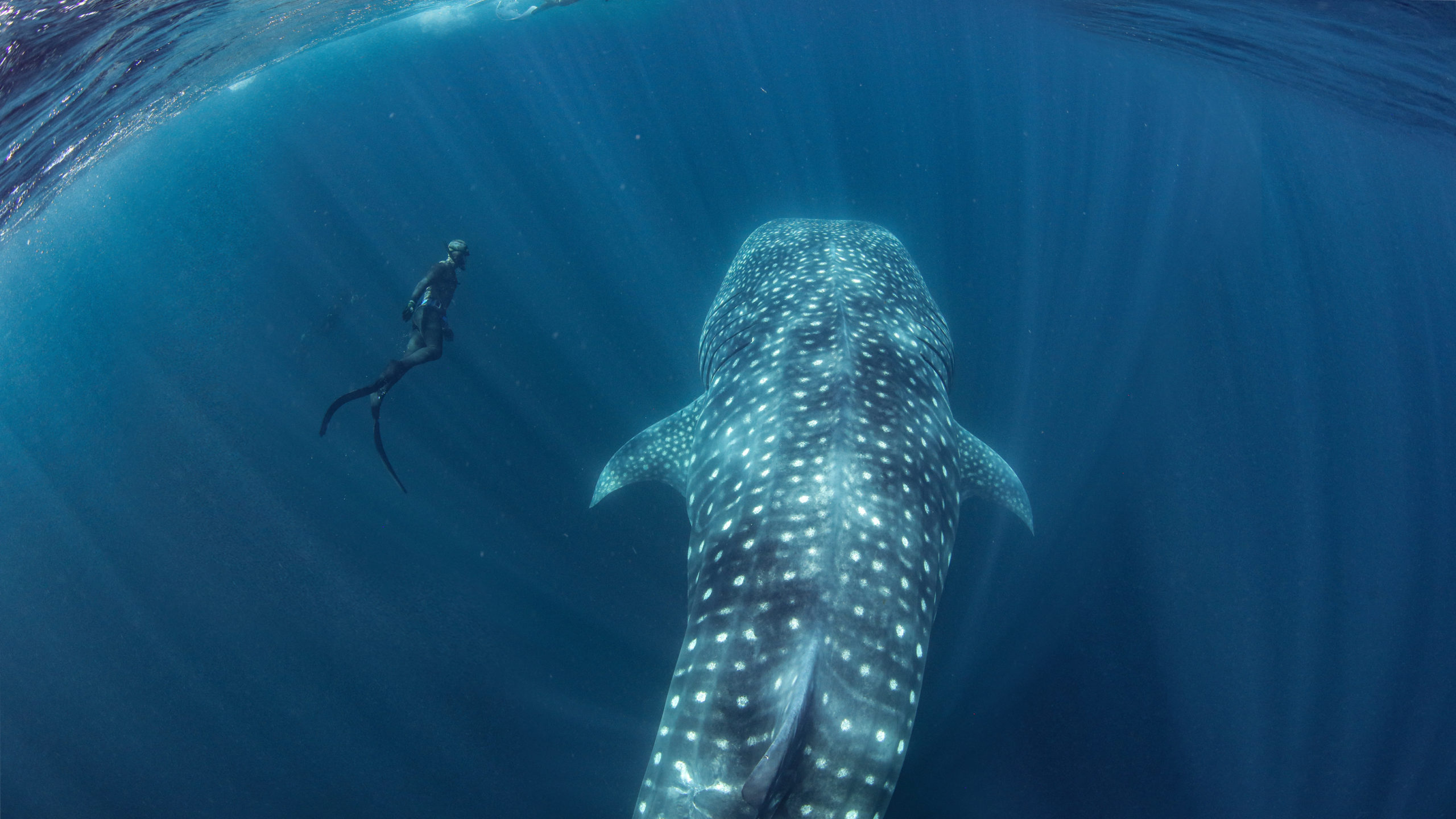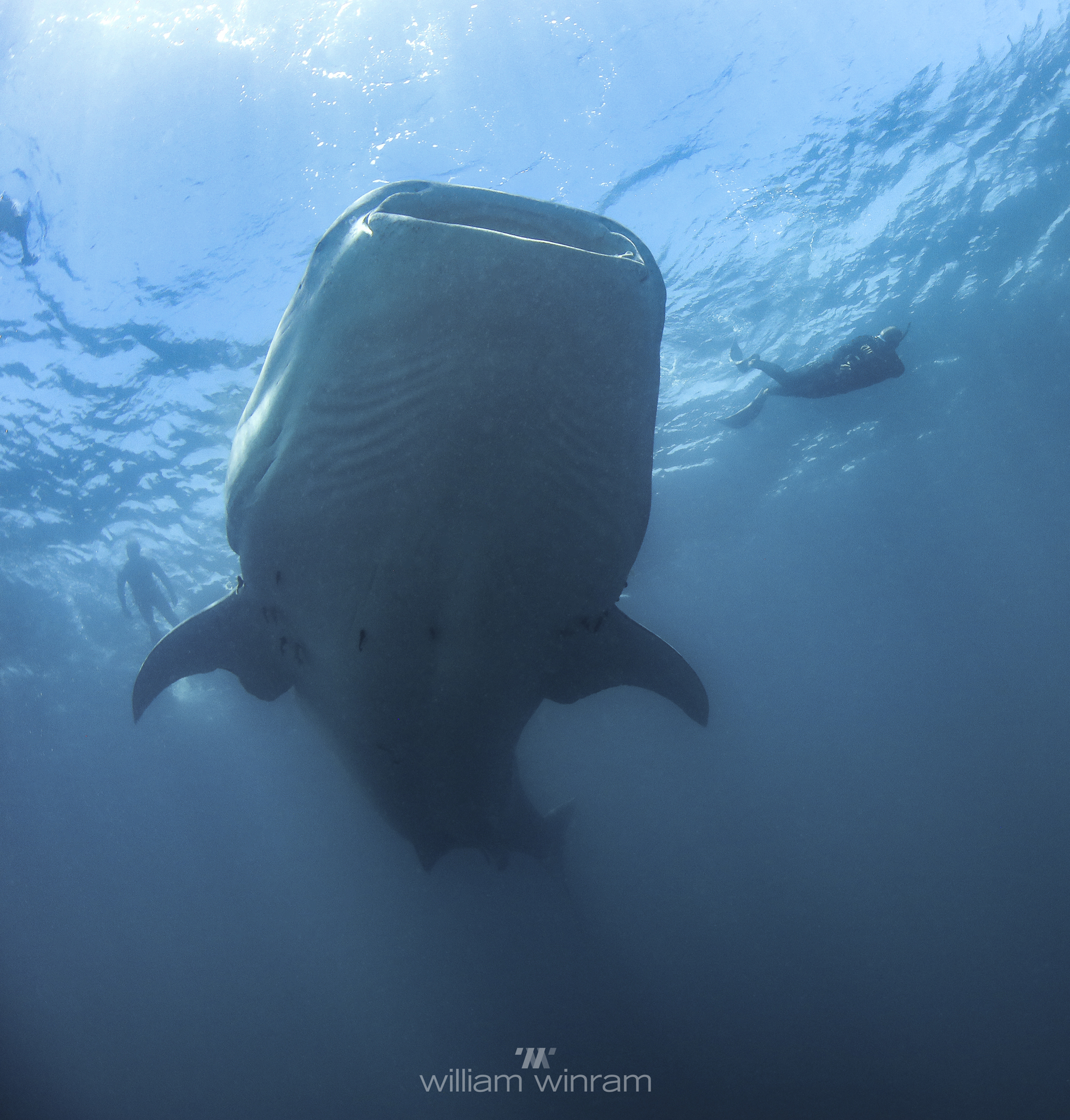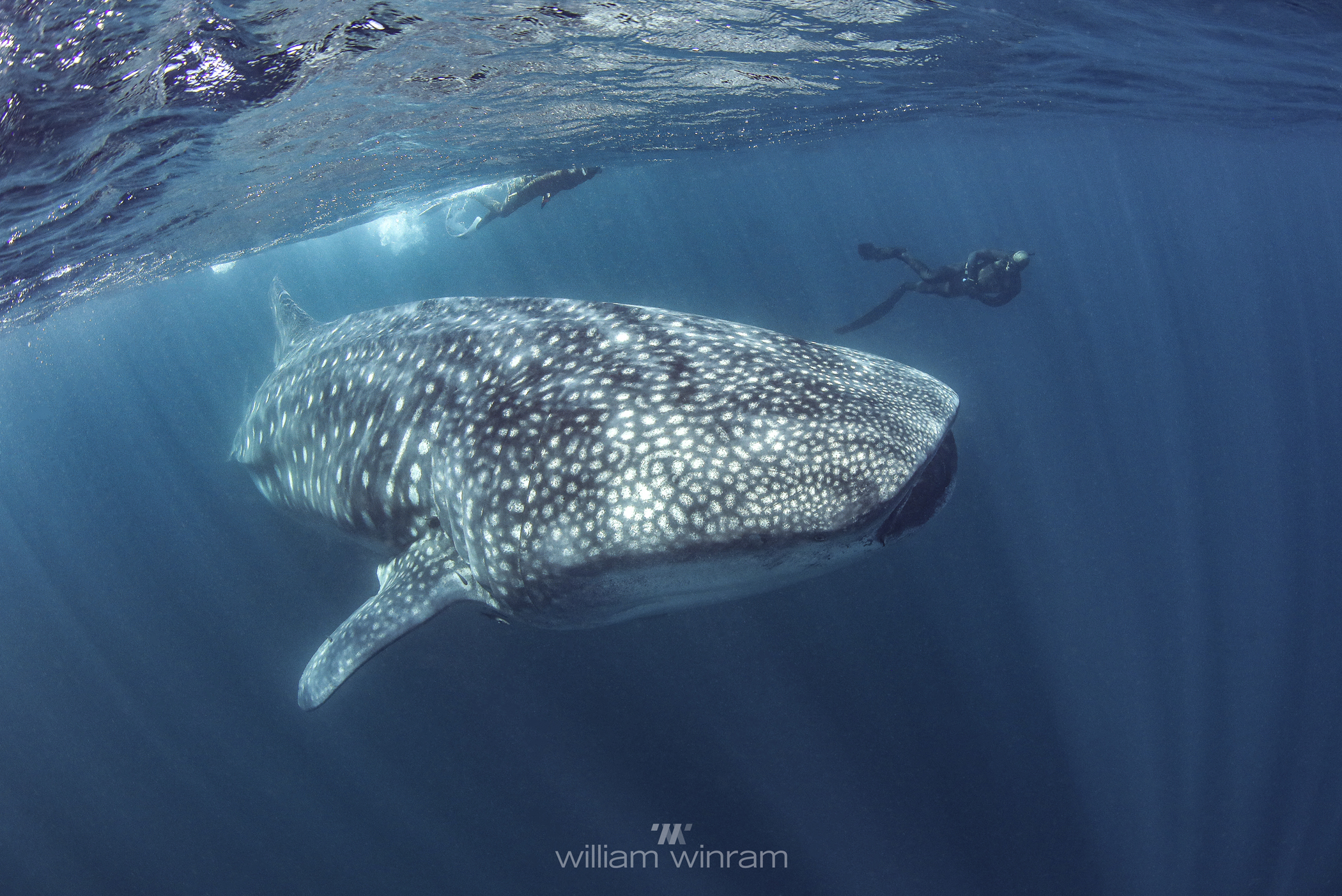 our team was dwarfed by the size of these huge fish… the smallest we encountered was 11m, cruising along the surface and patiently allowing us to jump in the water, swimming as fast as we could vs the whale sharks cruising speed, while we placed the tags, hung on and tried to get some blood samples and then swim up for a quick breath of air before heading back down to try again. Exhausting but rewarding work and hopefully the satellite tags are going to give researchers a lot more information about where these animals head off to once they leave the bay and thus, help to improve and enforce their protections.